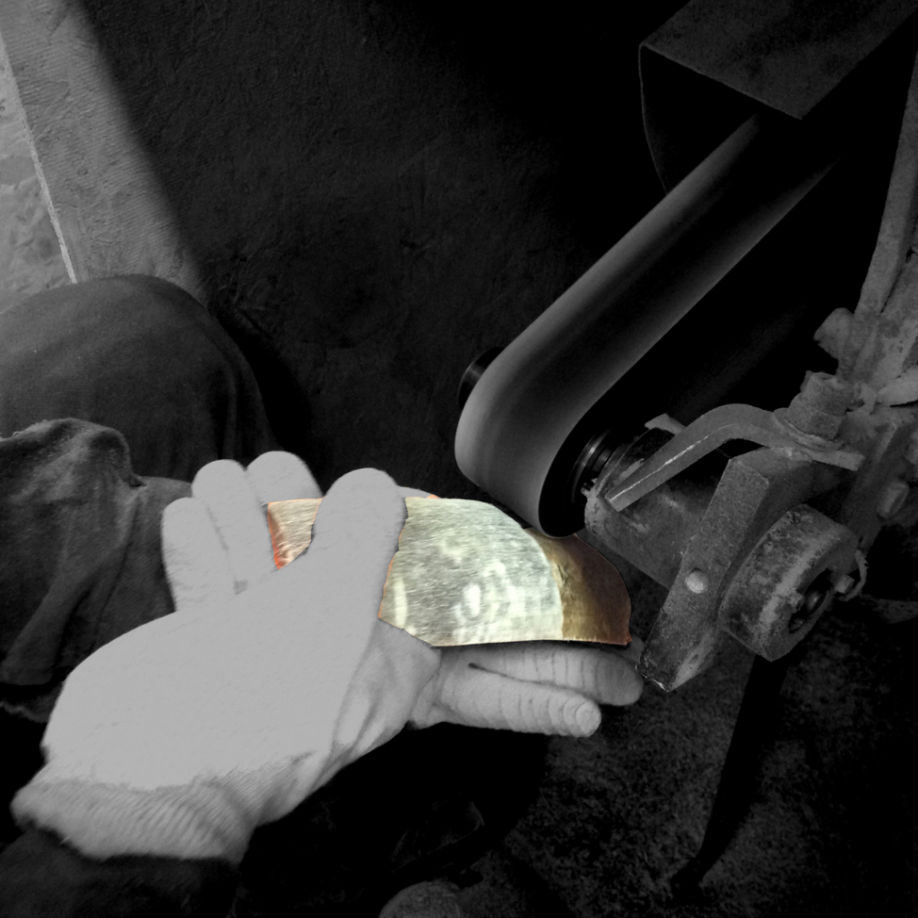 Le processus de transformation de la corne Sciage et découpe pour obtenir des plaquettes brutes.
